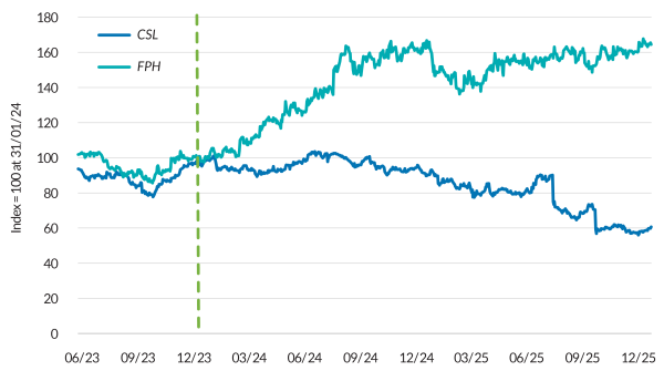 Figure 1: Market capitalisations of CSL & FPH indexed to 100 at 31/01/2024
