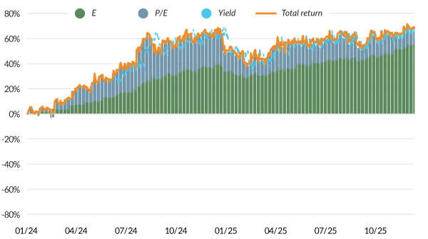 Figure 3: A breakdown total returns show FPH forward earnings expectations have grown while the valuation multiple has expanded, while investors are willing to pay ~45% less for CSL