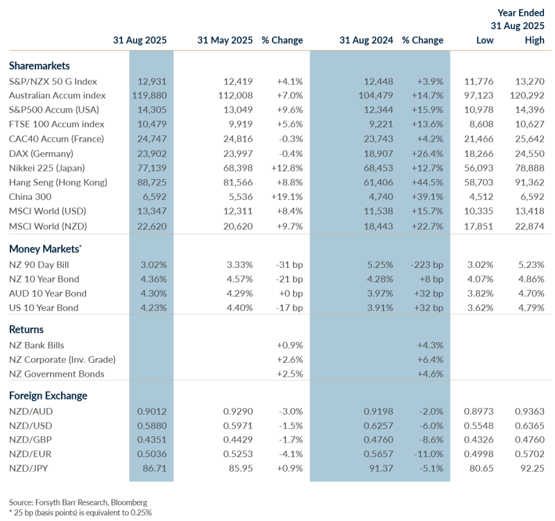 The Reserve Bank of New Zealand (RBNZ) responded to subdued economic conditions by cutting the cash rate in August and signalling further reductions ahead. Rates are expected to remain supportive for some time. Despite the challenging backdrop, the S&P/NZX 50 Index gained +4.1% for the quarter. There is increasing appeal in NZ’s defensive profile of high-quality, dividend-paying companies, particularly as interest rates continue to fall.