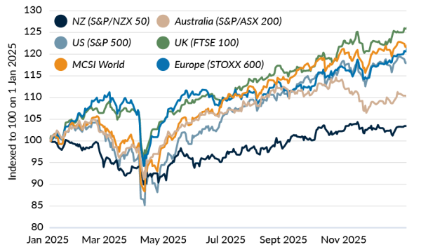 Global equity market performance since start of 2025, local currencies (index = 100 on 1 Jan 2025)